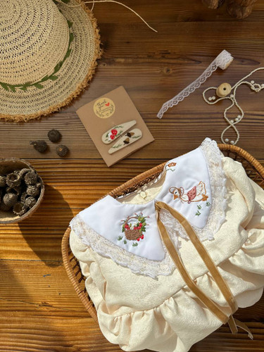پیراهن دخترانه گلدوزی شده یقه بب طرح جوجه طلایی مناسب 1تا8سال