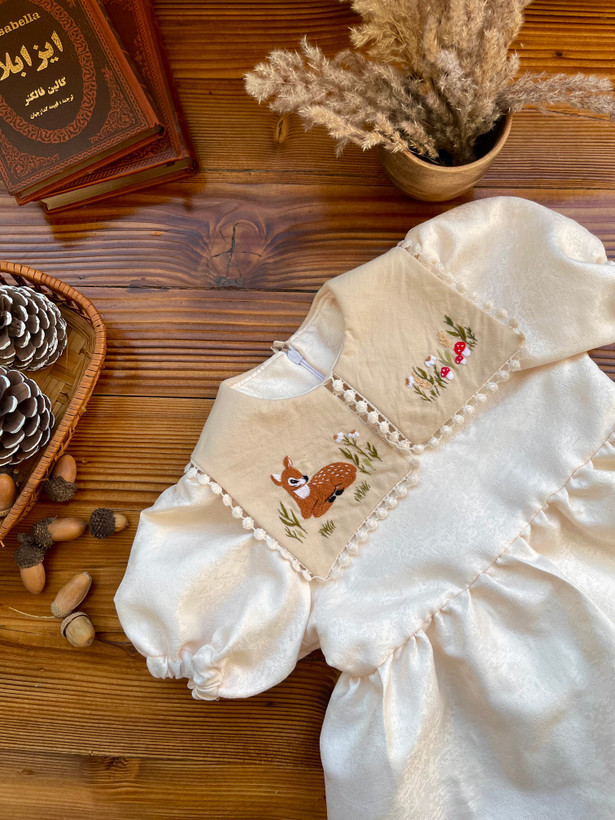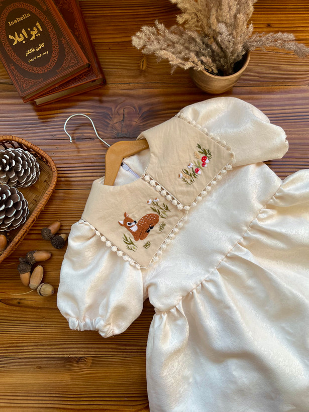 پیراهن دخترانه گلدوزی شده یقه بب طرح آهو خانم(رنگ شیری) مناسب تا 12سال